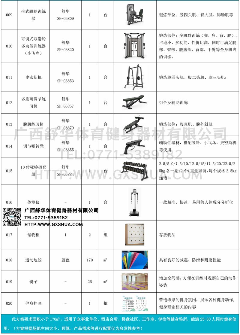 小飛鳥(1臺(tái))、史密斯機(jī)(1臺(tái))、多重可調(diào)節(jié)練習(xí)椅(1臺(tái))、腹肌板(1臺(tái))、10付啞鈴套組(1套)、啞鈴凳(1臺(tái))、上斜練習(xí)椅(1臺(tái)),可以實(shí)現(xiàn)對(duì)不同肌肉群的針對(duì)性訓(xùn)練,滿足肌肉訓(xùn)練需求,全方位激活身體機(jī)能。
