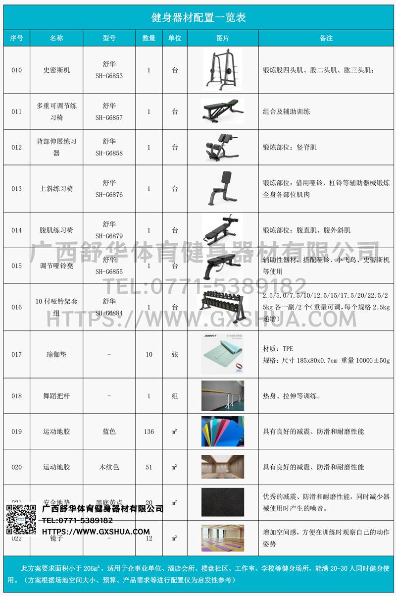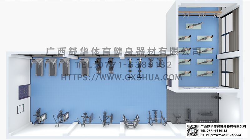 此方案要求面積小于206m2,適用于企事業(yè)單位、酒店會所、樓盤社區(qū)、工作室、學(xué)校等健身場所,能滿20-30人同時健身使用。(方案根據(jù)場地空間大小、預(yù)算、產(chǎn)品需求等進行配置僅為啟發(fā)性參考)
