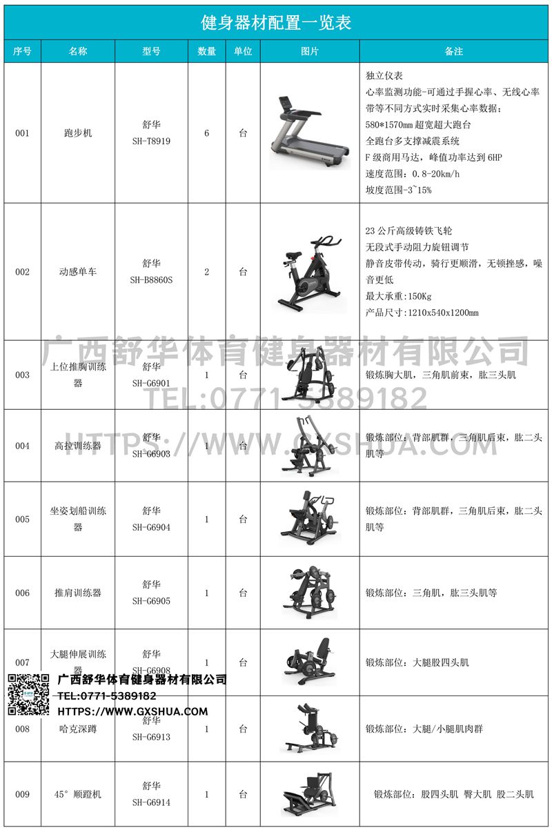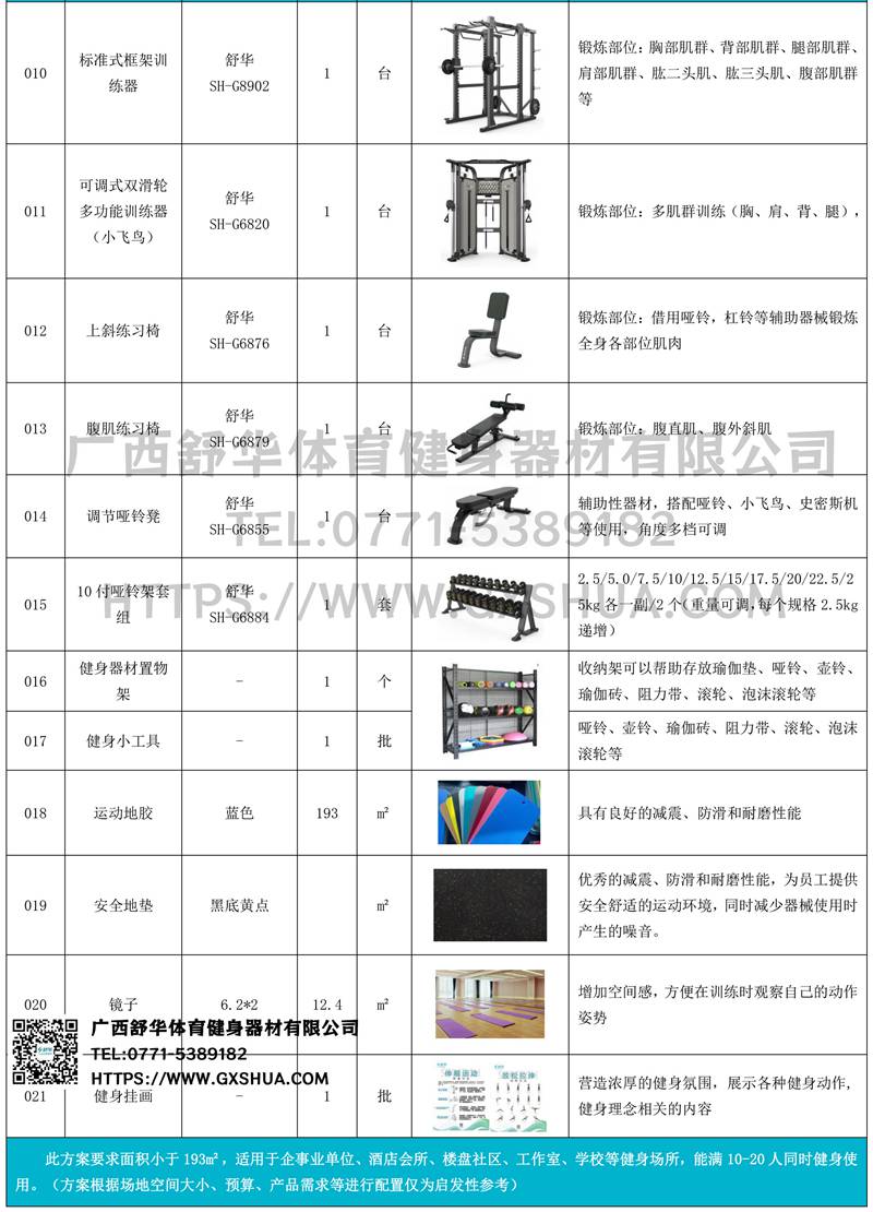 主要配置標(biāo)準(zhǔn)式框架訓(xùn)練器、小飛鳥、腹肌練習(xí)椅、10付啞鈴套組、啞鈴凳、上斜練習(xí)椅(各1臺(tái))可以實(shí)現(xiàn)對(duì)不同肌肉群的針對(duì)性訓(xùn)練,滿足肌肉訓(xùn)練需求,全方位激活身體機(jī)能。